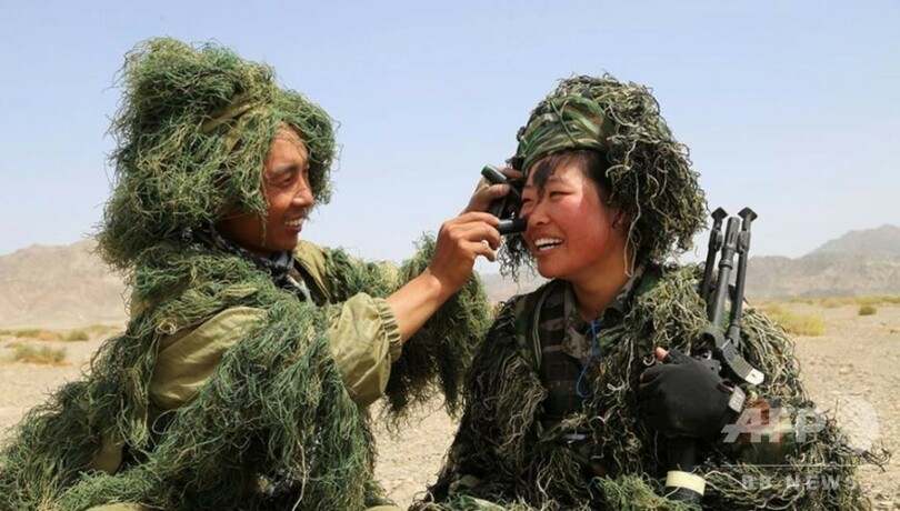 重さ30キロのリュックサックを背負いながら20キロの距離を行軍し、ターゲットの識別や、周囲の草木と一体となるカムフラージュ、素早く穴を掘る訓練などに取り組んだ。各チームは男女を問わず、厳格かつ困難な訓練に挑戦して作戦能力を高めた。(c)CNS/JCM/AFPBB News