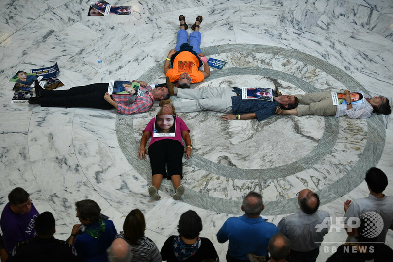 【8月2日 AFP】米首都ワシントンの連邦議会議事堂(Capitol Hill)のラッセル上院議員会館(Russell Senate Office Building)で、「移民の子どもに対する虐待と拘留に終止符を」と、夜を徹して祈念集会を行うフランシスカン・アクション・ネットワーク(Franciscan Action Network)のメンバーたち。(c)AFP