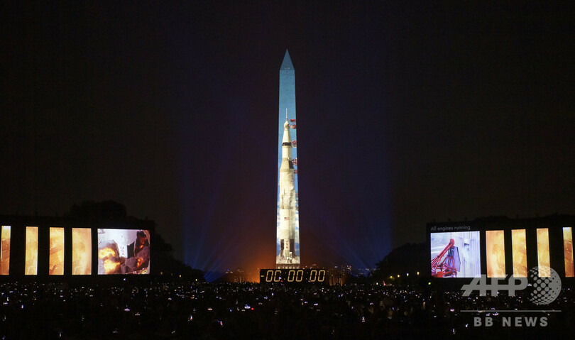 NASAは数週間にわたり、記念の展示やイベントを米国各地で開催してきた。アポロ11号を打ち上げたサターンV型(Saturn V)ロケットやミッションの映像をワシントン記念塔(Washington Monument)に投影する催しも行った。(c)AFP/Sébastien VUAGNAT, with Issam AHMED in Washington