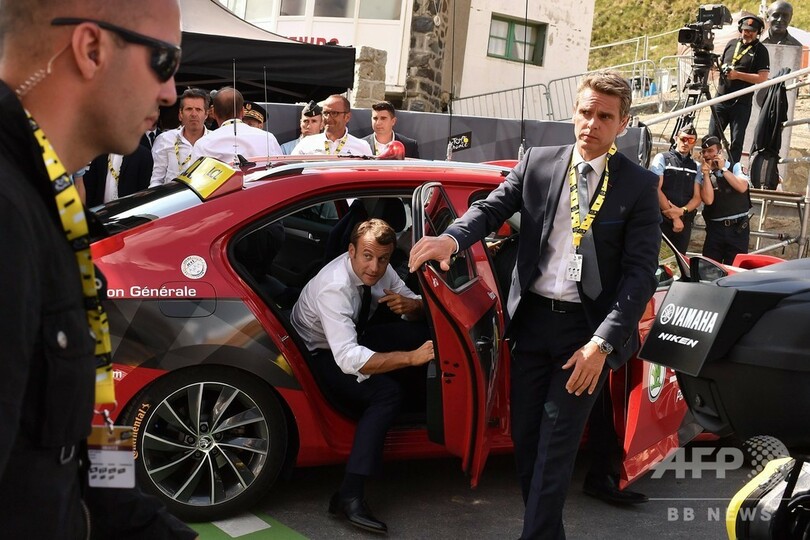この日はフランスのエマニュエル・マクロン(Emmanuel Macron)大統領が大勢の護衛に囲まれながら、先導車に乗って最初から最後までステージを見守った。表彰式で両脇をフランスの同胞2人に挟まれ、興奮した様子のマクロン大統領は、今や国の英雄となったアラフィリップを見ながら「この男にはハートがある」と評し、「フランスは二人を誇りに思う」と続けた。(c)AFP/Damian MCCALL