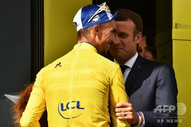 この日はフランスのエマニュエル・マクロン(Emmanuel Macron)大統領が大勢の護衛に囲まれながら、先導車に乗って最初から最後までステージを見守った。表彰式で両脇をフランスの同胞2人に挟まれ、興奮した様子のマクロン大統領は、今や国の英雄となったアラフィリップを見ながら「この男にはハートがある」と評し、「フランスは二人を誇りに思う」と続けた。(c)AFP/Damian MCCALL
