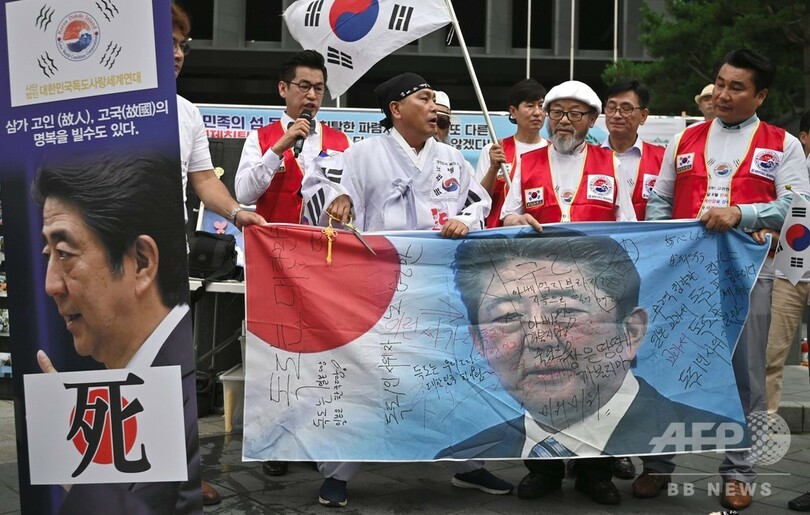 【7月23日 AFP】韓国・ソウルの在韓日本大使館近くで23日、日本政府による輸出管理強化措置への抗議デモが行われた。デモでは安倍晋三(Shinzo Abe)首相の顔が描かれた印刷物を切る参加者の姿も見られた。(c)AFP
