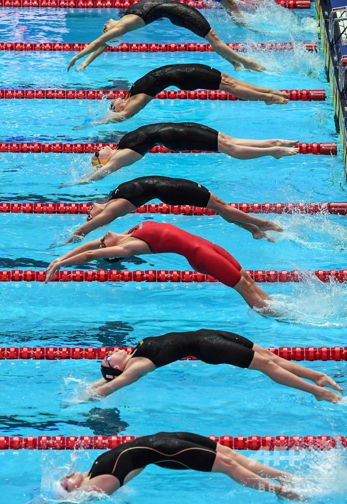 王者ケイティ・レデッキー(Katie Ledecky、米国)が体調不良で欠場した女子1500メートル自由形では、イタリアのシモナ・クアダレッラ(Simona Quadarella)が優勝。100メートル背泳ぎでは、女子はカイリー・マス(Kylie Masse、カナダ)が58秒60で連覇を達成し、男子は徐嘉余(Jiayu Xu、シュウ・ジアユー、中国)が52秒43で金メダルを獲得した。(c)AFP