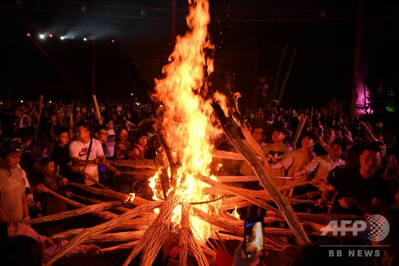 この「たいまつ祭」はイ族、ペー族、ナシ族、ラフ族、ハニ族、プミ族などの民族の伝統的な祭りで、旧暦の6月に2~3日間催される。(c)CNS/JCM/AFPBB News