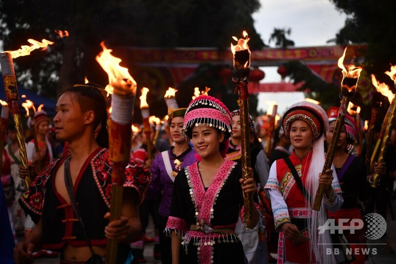 この「たいまつ祭」はイ族、ペー族、ナシ族、ラフ族、ハニ族、プミ族などの民族の伝統的な祭りで、旧暦の6月に2~3日間催される。(c)CNS/JCM/AFPBB News
