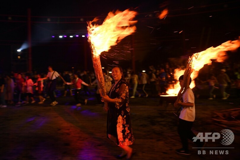 この「たいまつ祭」はイ族、ペー族、ナシ族、ラフ族、ハニ族、プミ族などの民族の伝統的な祭りで、旧暦の6月に2~3日間催される。(c)CNS/JCM/AFPBB News