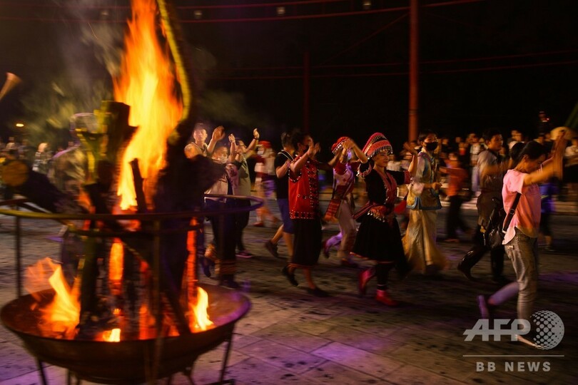 この「たいまつ祭」はイ族、ペー族、ナシ族、ラフ族、ハニ族、プミ族などの民族の伝統的な祭りで、旧暦の6月に2~3日間催される。(c)CNS/JCM/AFPBB News