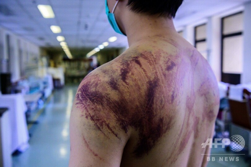 【7月26日 AFP】背中や腕にくっきりと、縦横に走る無数の赤いあざ──香港北西部・元朗(Yuen Long)区の鉄道駅で犯罪組織「三合会(Triad)」の構成員とみられる集団が民主派のデモ参加者らを襲撃した事件で、デモに参加していないのに襲われた男性が24日、恐怖の一部始終をAFPに語った。