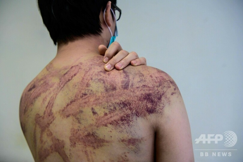 【7月26日 AFP】背中や腕にくっきりと、縦横に走る無数の赤いあざ──香港北西部・元朗(Yuen Long)区の鉄道駅で犯罪組織「三合会(Triad)」の構成員とみられる集団が民主派のデモ参加者らを襲撃した事件で、デモに参加していないのに襲われた男性が24日、恐怖の一部始終をAFPに語った。