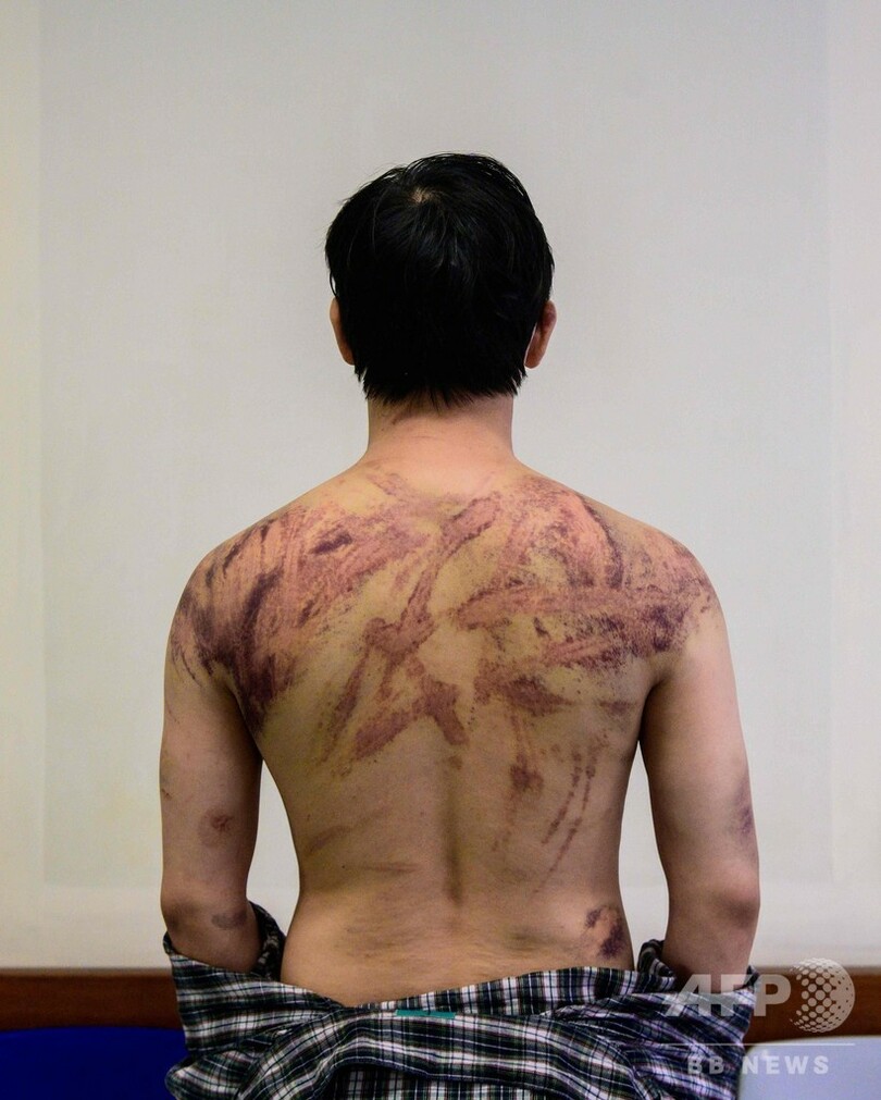 【7月26日 AFP】背中や腕にくっきりと、縦横に走る無数の赤いあざ──香港北西部・元朗(Yuen Long)区の鉄道駅で犯罪組織「三合会(Triad)」の構成員とみられる集団が民主派のデモ参加者らを襲撃した事件で、デモに参加していないのに襲われた男性が24日、恐怖の一部始終をAFPに語った。