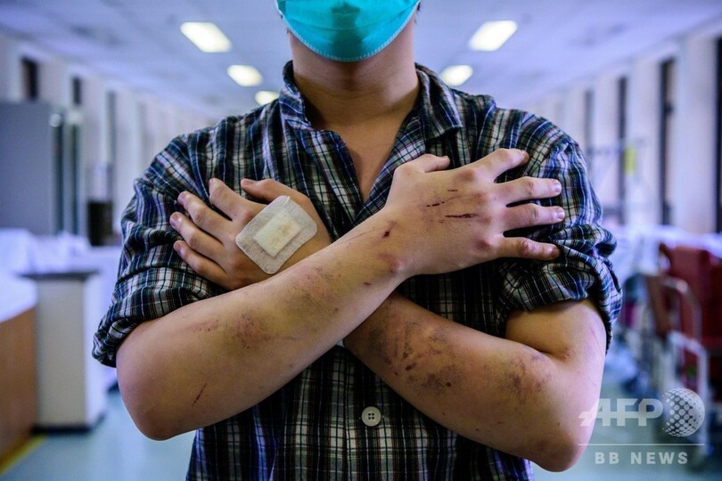 【7月26日 AFP】背中や腕にくっきりと、縦横に走る無数の赤いあざ──香港北西部・元朗(Yuen Long)区の鉄道駅で犯罪組織「三合会(Triad)」の構成員とみられる集団が民主派のデモ参加者らを襲撃した事件で、デモに参加していないのに襲われた男性が24日、恐怖の一部始終をAFPに語った。