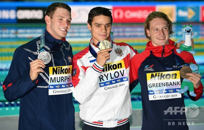 男子200メートル背泳ぎ決勝では、ロシアのエフゲニー・リロフ(Evgeny Rylov)が1分53秒40で大会連覇を達成し、この日はロシア勢が三つの金メダルを獲得した。(c)AFP/Alastair HIMMER