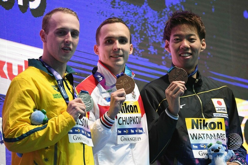 【7月27日 AFP】第18回世界水泳選手権(18th FINA World Championships)は26日、競泳男子200メートル平泳ぎ決勝が行われ、渡辺一平(ippei Watanabe)が2分6秒73で3位に入り、銅メダルを獲得した。