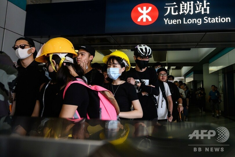 【7月27日 AFP】中国本土に近い香港北西部の元朗(Yuen Long)区で27日、白服の集団による民主派デモ参加者襲撃事件を受けてデモ禁止令が出されているにもかかわらず、多数の市民が鉄道駅に集まり、襲撃に抗議するデモ行進を始めた。