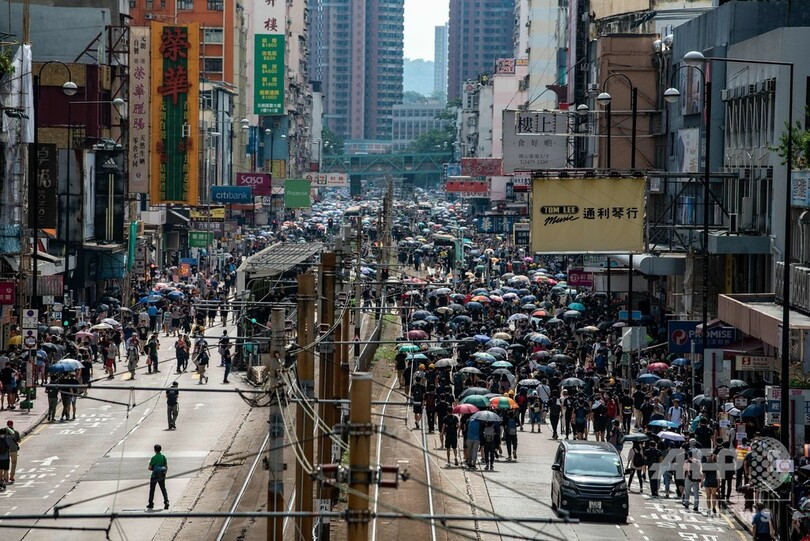 【7月27日 AFP】中国本土に近い香港北西部の元朗(Yuen Long)区で27日、白服の集団による民主派デモ参加者襲撃事件を受けてデモ禁止令が出されているにもかかわらず、多数の市民が鉄道駅に集まり、襲撃に抗議するデモ行進を始めた。