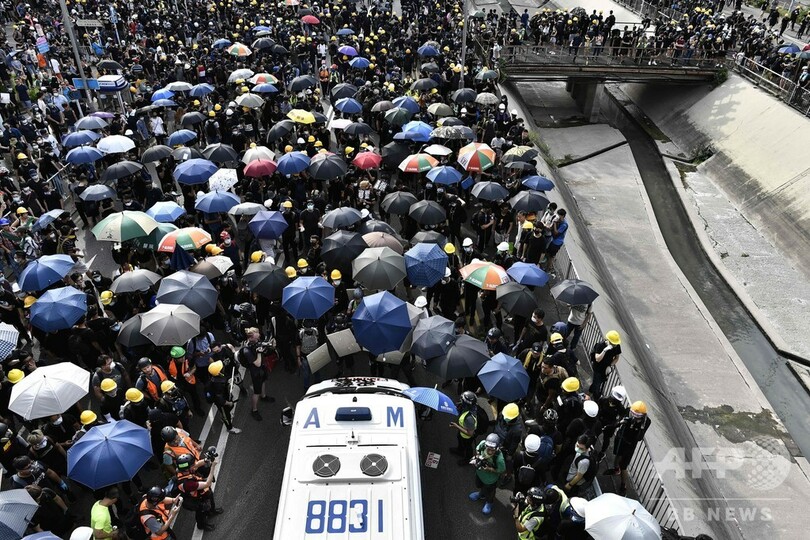 【7月27日 AFP】香港北西部の元朗(Yuen Long)区で27日、1週間前に起きた白服の集団による民主派デモ参加者襲撃に抗議する人々に向けて、警官隊が催涙弾を発射した。国際的な金融のハブ(中心地)である香港は、混乱の様相を呈している。