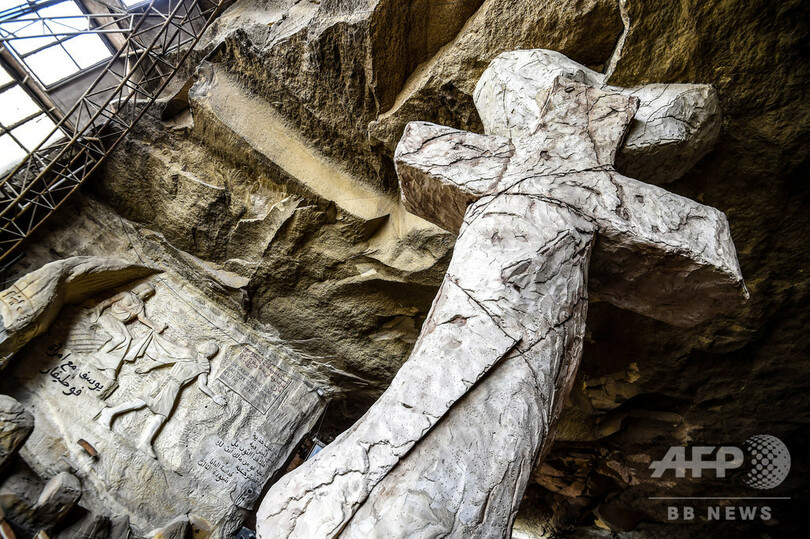 【8月10日 AFP】マリオさん(51)は口笛を吹きながら、エジプト・カイロのモッカタム(Mokkatam)の丘の上にある洞窟教会として知られる聖シモン修道院(St. Simon Monastery)で、岩窟に巡らされた足場をよじ登り、彫刻に最後の仕上げを施していた。
