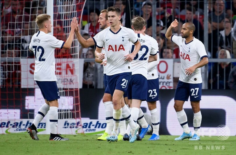 トッテナムはエリク・ラメラ(Erik Lamela)とクリスティアン・エリクセン(Christian Eriksen)の得点で2-0とリードするも、後半にはバイエルンに新加入した19歳ヤン・フィーテ・アープ(Jann Fiete Arp)と18歳のアルフォンソ・デービス(Alphonso Davies)にゴールを許し、追いつかれた。(c)AFP
