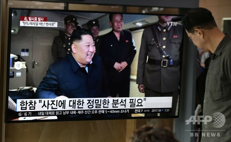 北朝鮮の国営テレビが放送した写真には、金正恩(キム・ジョンウン、Kim Jong-Un)朝鮮労働党委員長が先月31日、移動式の指揮所とみられる場所から発射を監督する様子や、兵器が上空へと発射される様子を見守る同委員長のシルエットが捉えられている。
