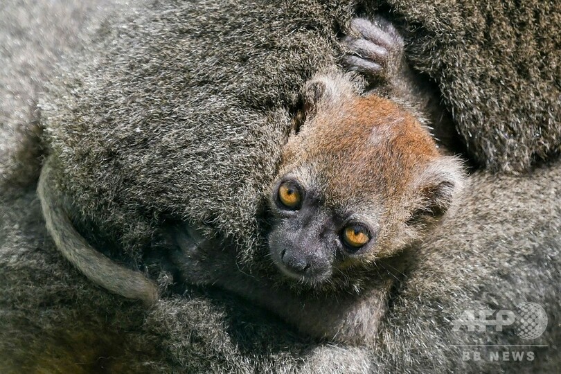 【8月2日 AFP】フランス東部ブザンソン(Besancon)の動物園で、母親に抱かれるヒロバナジェントルキツネザルの赤ちゃん。7月2日に生まれたばかりで、名前はまだないという。