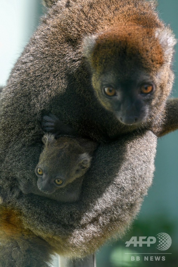 【8月2日 AFP】フランス東部ブザンソン(Besancon)の動物園で、母親に抱かれるヒロバナジェントルキツネザルの赤ちゃん。7月2日に生まれたばかりで、名前はまだないという。