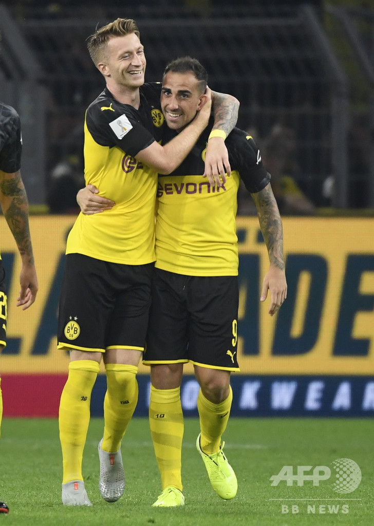 ドルトムントも、夏の補強の目玉であるトルガン・アザール(Thorgen Hazard)とユリアン・ブラント(Julian Brandt)、バイエルンから3シーズンぶりに復帰したマッツ・フンメルス(Mats Hummels)は全員けがのため欠場した。(c)AFP