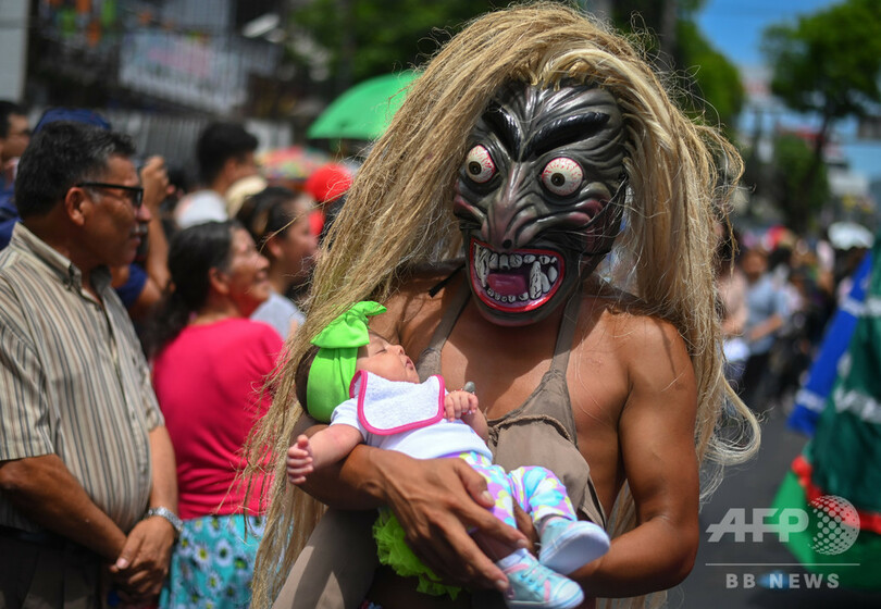 【8月13日 AFP】エルサルバドルのサンサルバドルで行われた、同市の守護聖人「ディビノ・サルバドル・デル・ムンド(Divine Savior of the World)」の祭りで、神話上のキャラクターの面を着けて、赤ちゃんを抱くパレードの参加者。(c)AFP