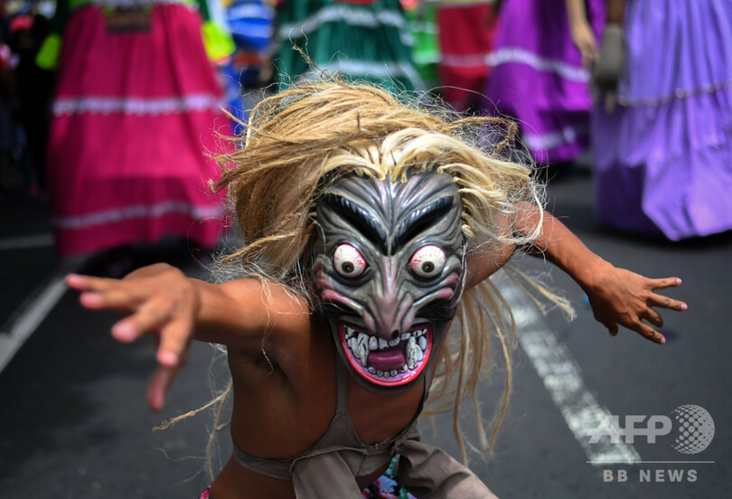 【8月13日 AFP】エルサルバドルのサンサルバドルで行われた、同市の守護聖人「ディビノ・サルバドル・デル・ムンド(Divine Savior of the World)」の祭りで、神話上のキャラクターの面を着けて、赤ちゃんを抱くパレードの参加者。(c)AFP