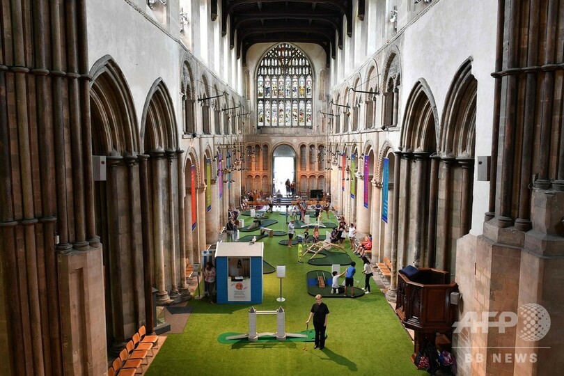 【8月7日 AFP】英イングランド南東部ロチェスター(Rochester)のロチェスター大聖堂(Rochester Cathedral)に、橋をテーマにした期間限定のミニゴルフコースが設置された。若い世代が橋を支える工学的技術を学ぶ場と、歴史ある聖堂に親しむ機会を提供するのが目的。(c)AFP