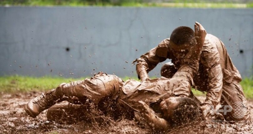 太陽が容赦なく照りつける酷暑の中、小銃を手にしながら障害物を素早く乗り越える訓練や、丸太を持ちながらの腹筋、「泥レスリング」など体力の極限に達する訓練を次々と行い、武装警察官としての意志を磨き、部隊のレベル向上を図った。(c)CNS/JCM/AFPBB News