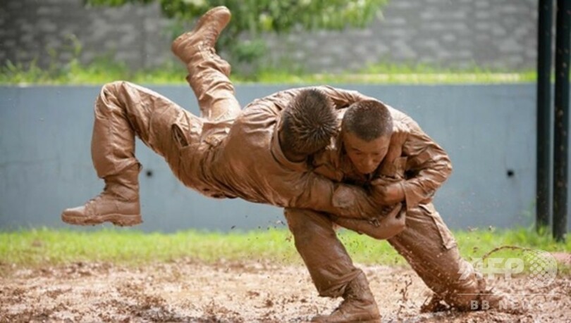 太陽が容赦なく照りつける酷暑の中、小銃を手にしながら障害物を素早く乗り越える訓練や、丸太を持ちながらの腹筋、「泥レスリング」など体力の極限に達する訓練を次々と行い、武装警察官としての意志を磨き、部隊のレベル向上を図った。(c)CNS/JCM/AFPBB News