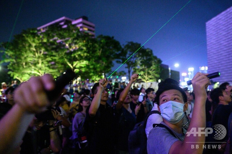 香港デモ、新たな抗議「レーザーショー」が夜を彩る