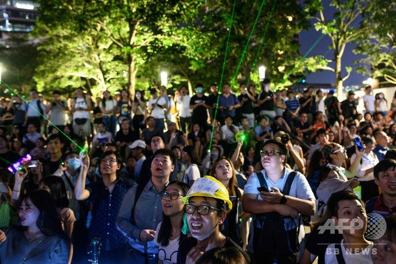 ドームや周辺の木々に緑色や紫色、赤色の光が目まぐるしく踊り、香港政府の出資で毎晩実施されているサーチライトやレーザービームによる光のショーと相まって夜空を彩ると、参加者からは歓声が上がり、「香港を取り戻せ、われわれの時代の革命だ」とのシュプレヒコールが飛び交った。(c)AFP