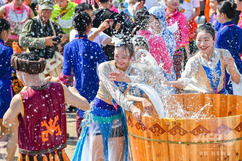 【8月8日 CNS】中国・海南省(Hainan)保亭リ族ミャオ族自治県(Baoting Li and Miao Autonomous County)の七仙広場で7日、旧暦7月7日の「七夕」祭りが開催された。1万人の地元の人たちと旅行客が一緒に「七夕」の水かけ祭りを楽しんだ。(c)CNS/JCM/AFPBB News