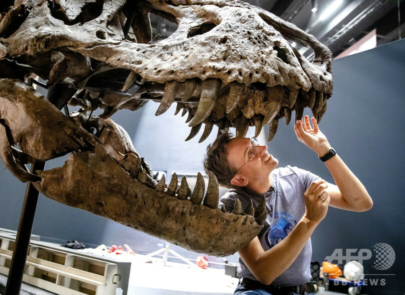 【8月18日 AFP】オランダ・ライデン(Leiden)の博物館ナチュラリス(Naturalis)で、「トリックス(Trix)」と呼ばれる肉食恐竜ティラノサウルス・レックス(T・レックス、Tyrannosaurus rex)の骨格を組み立てる古生物学者。トリックスは、1か月にわたる欧州ツアーを経て、同博物館の新装オープンに合わせて戻った。(c)AFP