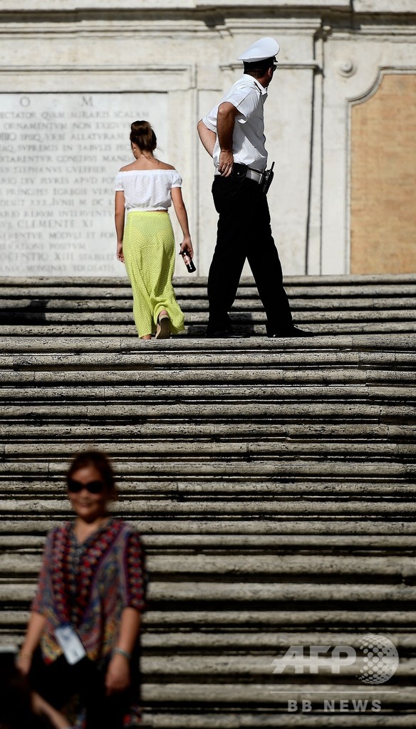 【8月9日 AFP】イタリアの「永遠の都」ローマ――その観光名所の一つが、オードリー・ヘプバーン(Audrey Hepburn)とグレゴリー・ペック(Gregory Peck)主演の米映画『ローマの休日(Roman Holiday)』(1954年)で有名になったスペイン階段(Spanish Steps)だ。だが、もはや階段に腰掛けて一休み、というわけにはいかなくなった。今夏から市当局が、この有名な階段に座ることを禁じる条例を新たに導入したためだ。6日に現場を訪れたAFPのカメラマンによると、警官が階段に腰掛けた人たちに向かって笛を吹き鳴らして退くよう指示していたという。