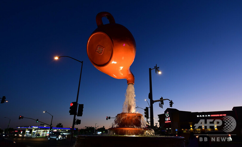 【8月28日 AFP】米カリフォルニア(California)州テンプルシティー(Temple City)にある立体作品、急須から水があふれ出る噴水「ソアリング・ティーポット(急上昇する急須、Soaring Teapot)」。