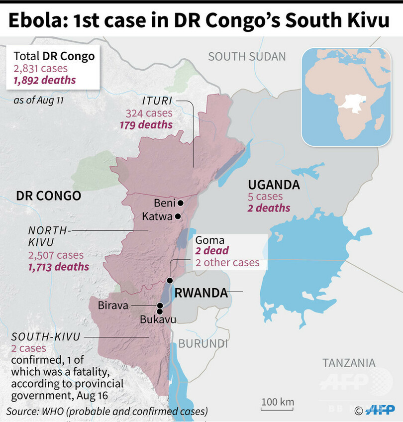 【8月17日 AFP】コンゴ民主共和国の南キブ(South Kivu)州当局は16日、同州で女性1人がエボラ熱で死亡し、生後7か月の息子もエボラウイルスへの感染が確認されたと発表した。同州でエボラ熱患者が確認されたのは初めてで、感染力の強い同ウイルスが周辺地域に広がる恐れが高まっている。