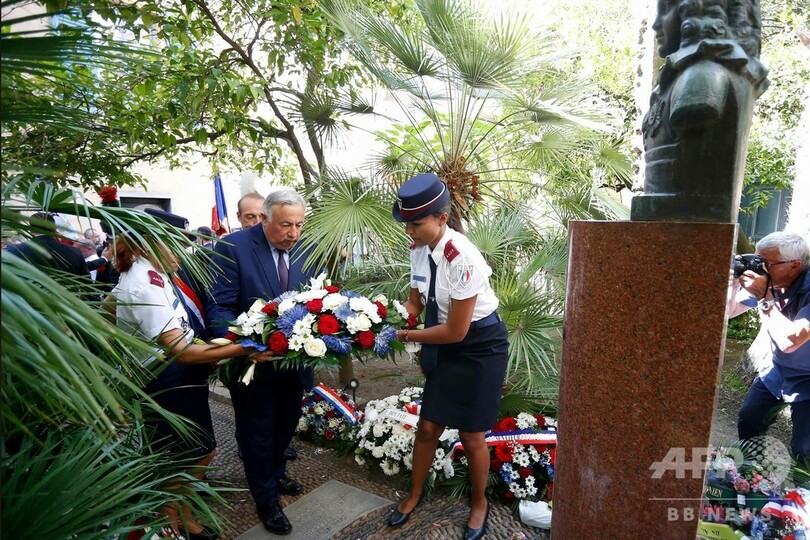 コルシカ島では12日からナポレオン生誕250年の記念行事が開かれており、15日にはナポレオンの生家で上院議員による献花が行われた。(c)AFP