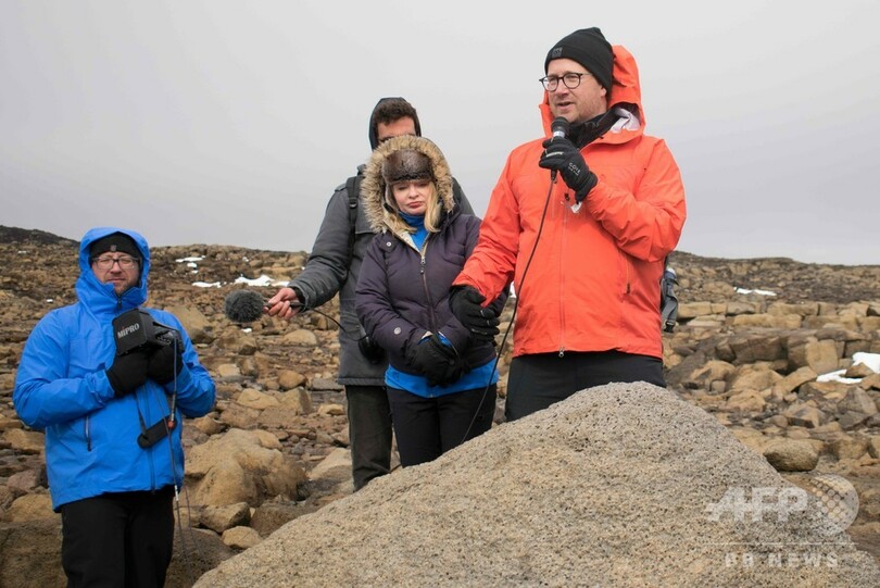 【8月19日 AFP】アイスランド西部で18日、気候変動で失われた同国初の氷河「オクヨクットル(Okjokull)」があった場所の岩に設置された「未来への手紙」を刻んだ銘板の公開式典が行われた。