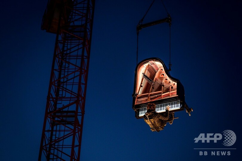 【9月3日 AFP】スイスのイヴェルドン・レ・バン(Yverdon-les-Bains)で開催された、音楽やインスタレーション、舞台など幅広い分野を扱ったアートの祭典「第20回ジュー・ドゥ・カストラム(Jeux du Castrum)」で、グランドピアノとともにクレーン車で宙につるされ、「仕事場」を意味する「シャンティエ(Chantier)」というパフォーマンスを披露した同国のピアニストで作曲家のアラン・ロシュ(Alain Roche)さん。(c)AFP