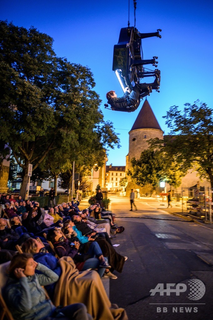 【9月3日 AFP】スイスのイヴェルドン・レ・バン(Yverdon-les-Bains)で開催された、音楽やインスタレーション、舞台など幅広い分野を扱ったアートの祭典「第20回ジュー・ドゥ・カストラム(Jeux du Castrum)」で、グランドピアノとともにクレーン車で宙につるされ、「仕事場」を意味する「シャンティエ(Chantier)」というパフォーマンスを披露した同国のピアニストで作曲家のアラン・ロシュ(Alain Roche)さん。(c)AFP