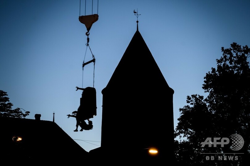 【9月3日 AFP】スイスのイヴェルドン・レ・バン(Yverdon-les-Bains)で開催された、音楽やインスタレーション、舞台など幅広い分野を扱ったアートの祭典「第20回ジュー・ドゥ・カストラム(Jeux du Castrum)」で、グランドピアノとともにクレーン車で宙につるされ、「仕事場」を意味する「シャンティエ(Chantier)」というパフォーマンスを披露した同国のピアニストで作曲家のアラン・ロシュ(Alain Roche)さん。(c)AFP