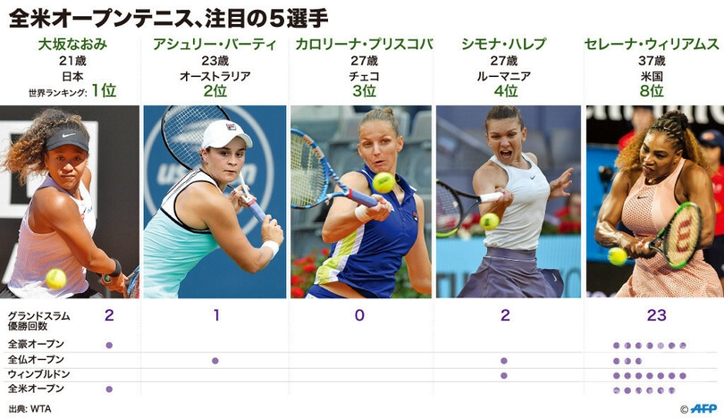 【8月26日 AFP】26日に開幕する全米オープンテニス(US Open Tennis Championships 2019)の女子シングルスでは、史上最多に並ぶ四大大会(グランドスラム)通算24勝目を目指すセレーナ・ウィリアムス(Serena Williams、米国)が注目を集める一方で、大坂なおみ(Naomi Osaka)ら今年のグランドスラム女王や、世界ランキング上位の選手も大会制覇を狙う。