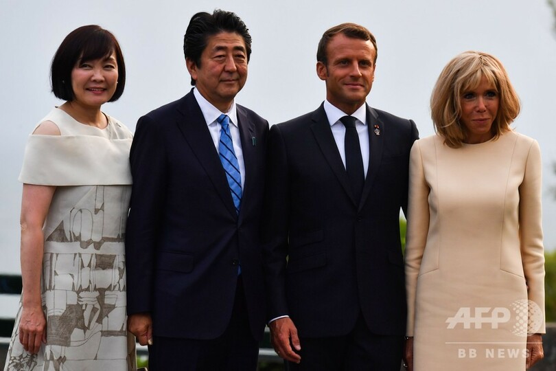 また、安倍首相は昭恵(Akie Abe)夫人とともに、ビアリッツ灯台前広場でマクロン大統領とブリジット(Brigitte Macron)夫人の出迎えを受けた。(c)AFP