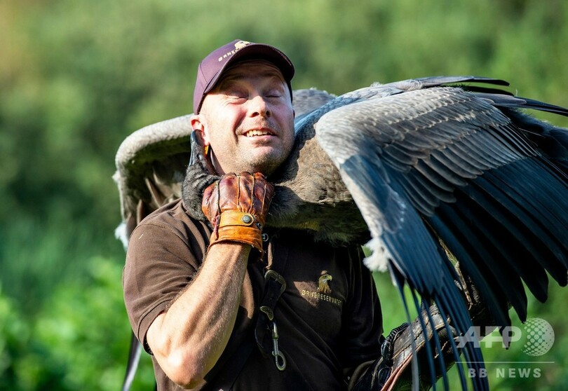 【8月29日 AFP】デンマーク・北ユトランド(Northern Jutland)地域にある鳥類保護区で27日、調教師のピーター・ベンツェル(Peter Wenzel)さんと訓練に励むコンドル「モリーナ」の姿が見られた。モリーナは2018年11月に保護されてから、毎日訓練を受けている。コンドルは世界最大の猛禽(もうきん)類で、成鳥の広げた両翼の端から端までの長さは3.5メートル、体重15キロに及ぶ。(c)AFP