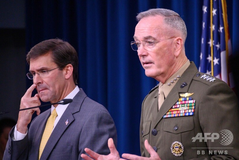 ジョセフ・ダンフォード(Joseph Dunford)統合参謀本部議長も同じ記者会見で、現時点では韓国のGSOMIA破棄通告による軍事活動への影響は見られないと述べたが、エスパー氏と同様に懸念も表明した。(c)AFP