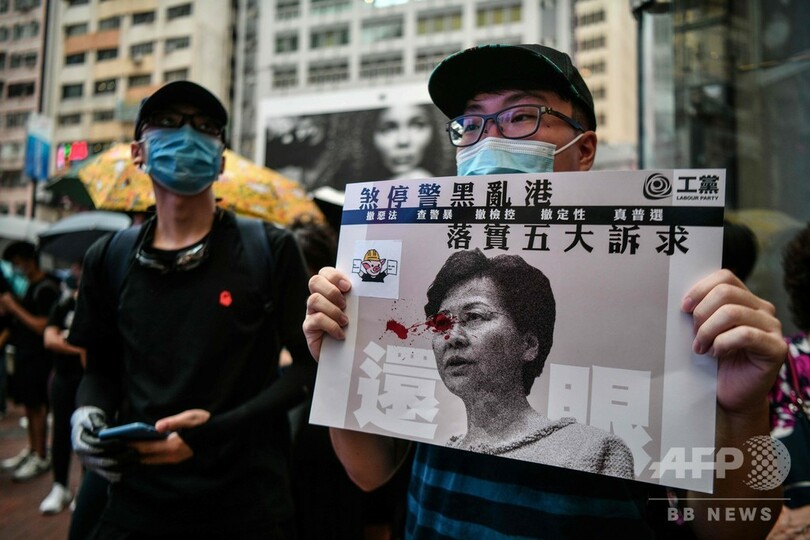 これに先立ち、デモ隊の一部は同日、林鄭月娥(キャリー・ラム、Carrie Lam)行政長官の公邸そばを行進。同長官は「逃亡犯条例」改正案の成立を試みて以来、デモ隊の怒りを一身に浴びている。(c)AFP/Yan ZHAO and Jasmine LEUNG