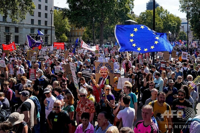 【9月1日 AFP】英国各地で8月31日、欧州連合(EU)離脱(ブレグジット、Brexit)期限直前の10月半ばまで議会を閉会すると宣言したボリス・ジョンソン(Boris Johnson)首相に対する抗議デモが行われた。