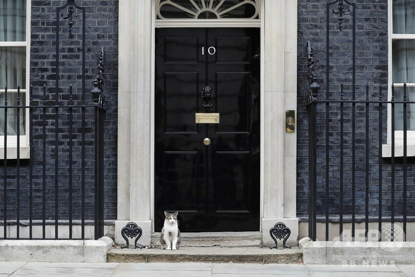 子犬は救助犬として知られるジャックラッセルテリアの雄で、英動物愛護団体「フレンズ・オブ・アニマルズ・ウェールズ(Friends of Animals Wales)」が保護していた。だが、首相官邸には長年、猫のラリー(Larry)が住んでおり、この日も官邸の玄関前に姿を見せた。(c)AFP